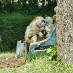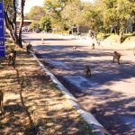 An einem Tag ging es von Namibia über Botswana nach Simbabwe. Nach vier Grenzkontrollstellen erreichten wir Victoria Falls. Gut gerüstet mit langen Regencapes näherten wir uns den großen Fällen. Brausend ergoßen sich die Wassermassen in die Tiefe. Die Gischt und die feuchte Luft führten dazu, dass wir trotz Regenschutz ziemlich nass wurden urnd die hohen Schuhe lange brauchten, um wieder zu trocknen. Vom "The Lookout Café" hatten wir einen grandiosen Blick auf die Schlucht mit dem tosenden Sambesi. Auf der Wiese unmittelbar vor dem Restaurant grasten junge Wildschweine, die sich aber nicht für Touristen interessierten.